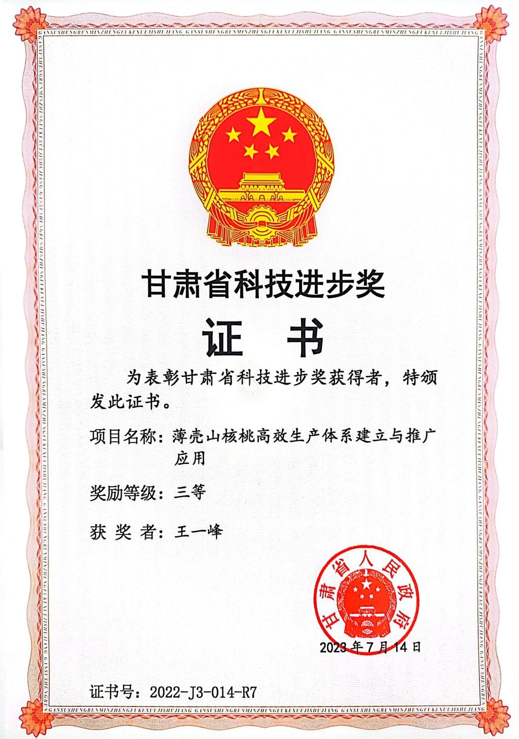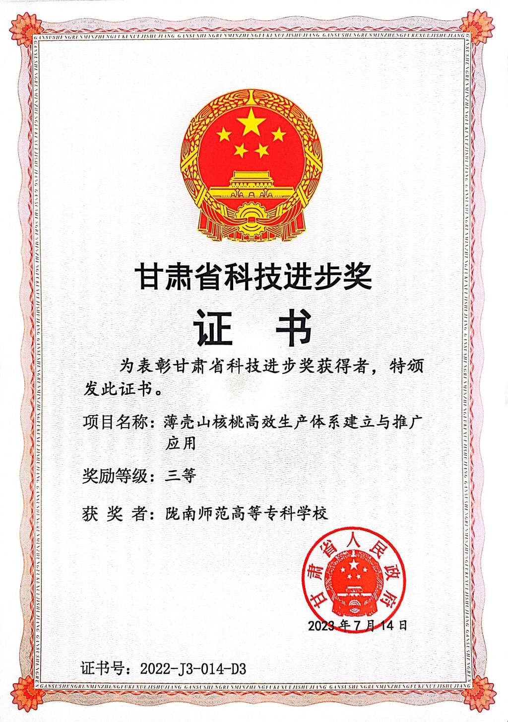 近日,甘肃省人民政府发布《关于2022年度甘肃省科学技术奖励的决定》,对2022年在我省科学技术进步、经济社会发展中作出突出贡献的科学技术人员和组织给予奖励。公司申博sunbet王一峰副教授参与完成的《薄壳山核桃高效生产体系建立与推广应用》成果荣获甘肃省科技进步三等奖(获奖编号:2023-J3-014)。这是公司作为成果完成单位、教学科研成员作为成果主要完成人,首次荣获甘肃省科技进步奖。