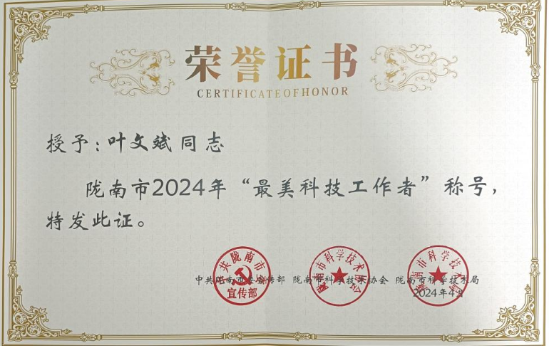 近日,陇南市“最美科技工作者”评选结果揭晓,公司经理叶文斌副教授获此殊荣。