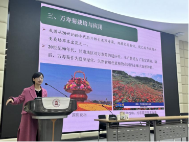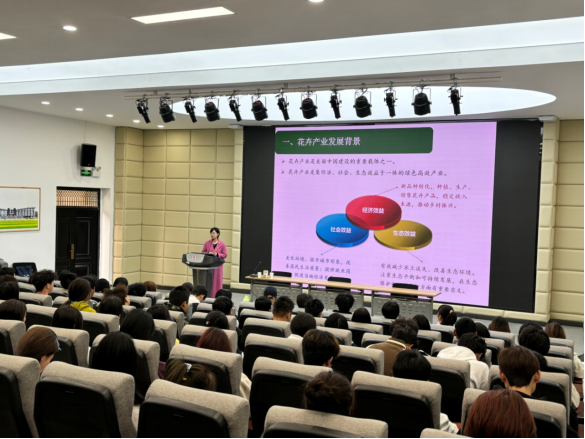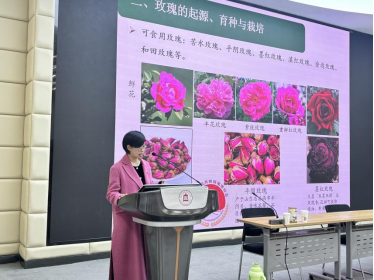 韩博士以“玫瑰、万寿菊等花卉栽培技术与开发利用”为主题,深入浅出地介绍了花卉产业的发展现状,详细讲解了玫瑰的起源、育种与栽培技术,万寿菊的栽培方法及其应用领域,并对牡丹和芍药的育种与栽培策略进行了阐述,同时探讨了花卉产品的多元化开发利用。韩博士的报告内容详实、观点新颖,赢得了在场师生的热烈掌声和高度评价。