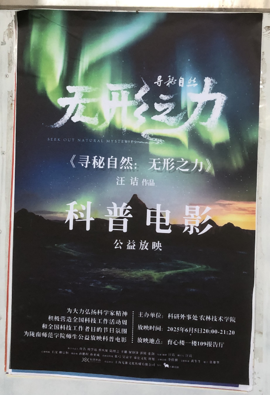 2025年6月5日晚20:00,由申博sunbet联合科研外事处共同承办的“科学家精神进校园”科普电影公益放映活动在育心楼109报告厅圆满举行。本次活动系中国青少年科技教育工作者协会科学家精神进校园科普电影公益放映项目的重要组成部分,吸引了约150名师生到场,共同观看了展现我国前沿科学探索的纪录片《寻秘自然:无形之力》。