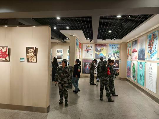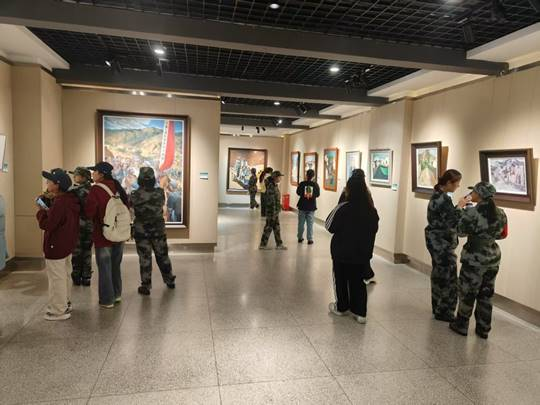 新生们身着迷彩服,在工作人员引导下欣赏国画、油画、书法等作品,尤其对农林生态主题作品兴趣浓厚,在交流中感受艺术魅力。